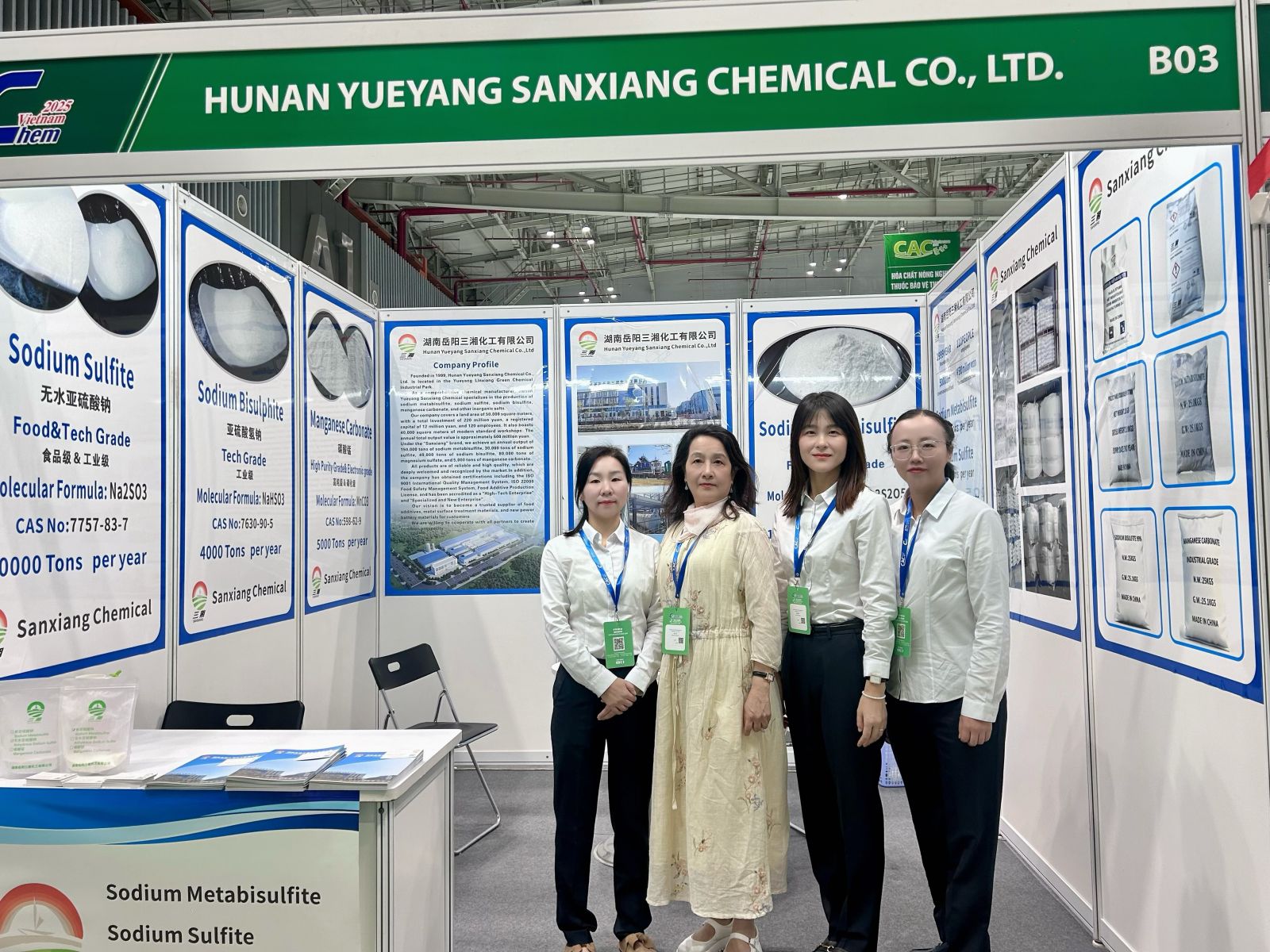 本次展会由中国国际贸易促进委员会化工行业分会与越南国家化工总公司联合主办,展览面积达 10000 平方米,吸引了 146 家全球化工企业参与,覆盖基础化工、精细化学品、化工装备等全产业链领域。作为中国无机盐化工领域的资深企业,三湘化工此次参展重点展示了焦亚硫酸钠、无水亚硫酸钠、碳酸锰等核心产品,其中食品级亚硫酸钠、亚硫酸氢钠及碳酸锰系列产品因符合欧盟 REACH 标准及越南绿色转型政策要求,引发越南本土及东南亚采购商广泛关注。