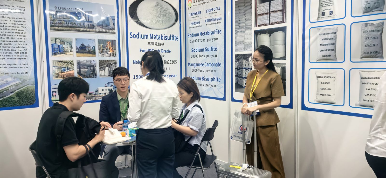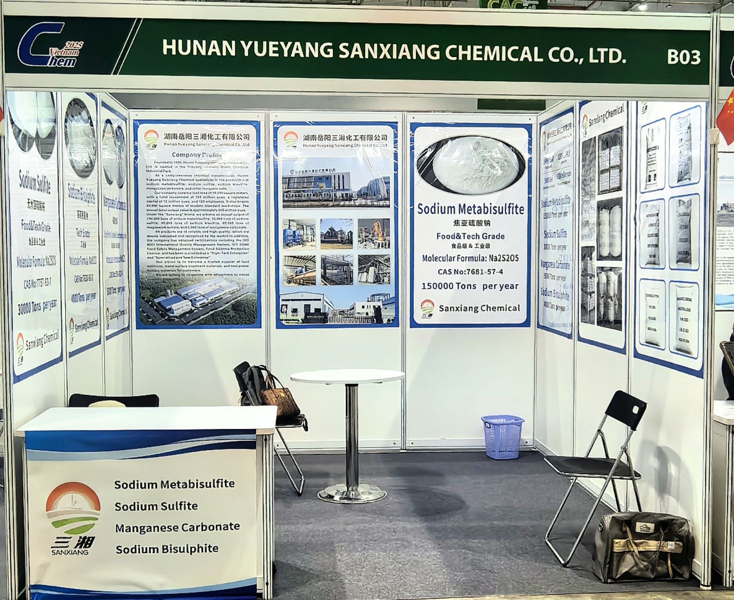 This exhibition was co-hosted by the Chemical Industry Sub-Council of the China Council for the Promotion of International Trade and the Vietnam National Chemical Corporation. With an exhibition area of 10,000 square meters, it attracted 146 global chemical enterprises to participate, covering the entire industrial chain fields such as basic chemicals, fine chemicals, and chemical equipment. As a senior enterprise in China's inorganic salt chemical field, Sanxiang Chemical focused on displaying core products such as sodium metabisulfite, anhydrous sodium sulfite, and manganese carbonate at this exhibition. Among them, food-grade sodium sulfite, sodium bisulfite, and manganese carbonate series products have attracted wide attention from local Vietnamese and Southeast Asian buyers due to their compliance with the EU REACH standards and the requirements of Vietnam's green transition policies.